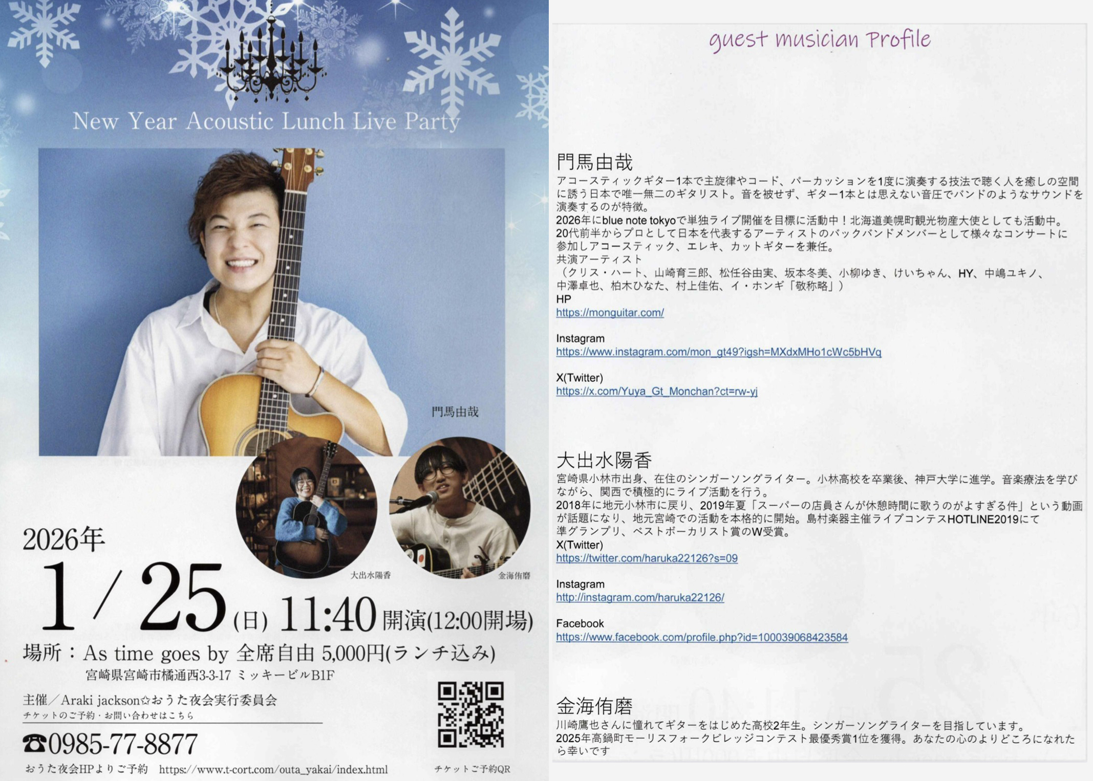 | 概要 | guest musician 門馬由哉(Tokyo) 大出水陽香(Miyazaki) 金海侑磨(Miyazaki) その他決定次第発表 プロフィール 門馬由哉 アコースティックギター1本で主旋律やコード、パーカッションを1度に演奏する技法で聴く人を癒しの空間に誘う日本で唯一無二のギタリスト。音を被せず、ギター1本とは思えない音圧でバンドのようなサウンドを演奏するのが特徴。 2026年にblue note tokyoで単独ライブ開催を目標に活動中!北海道美幌町観光物産大使としても活動中。20代前半からプロとして日本を代表するアーティストのバックバンドメンバーとして様々なコンサートに参加しアコースティック、エレキ、カットギターを兼任。 共演アーティスト (クリス・ハート、山崎育三郎、松任谷由実、坂本冬美、小柳ゆき、けいちゃん、HY、中嶋ユキノ、中澤卓也、柏木ひなた、村上佳佑、イ・ホンギ「敬称略」) 大出水陽香 宮崎県小林市出身、在住のシンガーソングライター。小林高校を卒業後、神戸大学に進学。音楽療法を学びながら、関西で積極的にライブ活動を行う。 2018年に地元小林市に戻り、2019年夏「スーパーの店員さんが休憩時間に歌うのがよすぎる件」という動画が話題になり、地元宮崎での活動を本格的に開始。島村楽器主催ライブコンテスHOTLINE2019にて準グランプリ、ベストボーカリスト賞のW受賞。 金海侑磨 川崎鷹也さんに憧れてギターをはじめた高校2年生。シンガーソングライターを目指しています。 2025年高鍋町モーリスフォークビレッジコンテスト最優秀賞1位を獲得。あなたの心のよりどころになれたら幸いです |