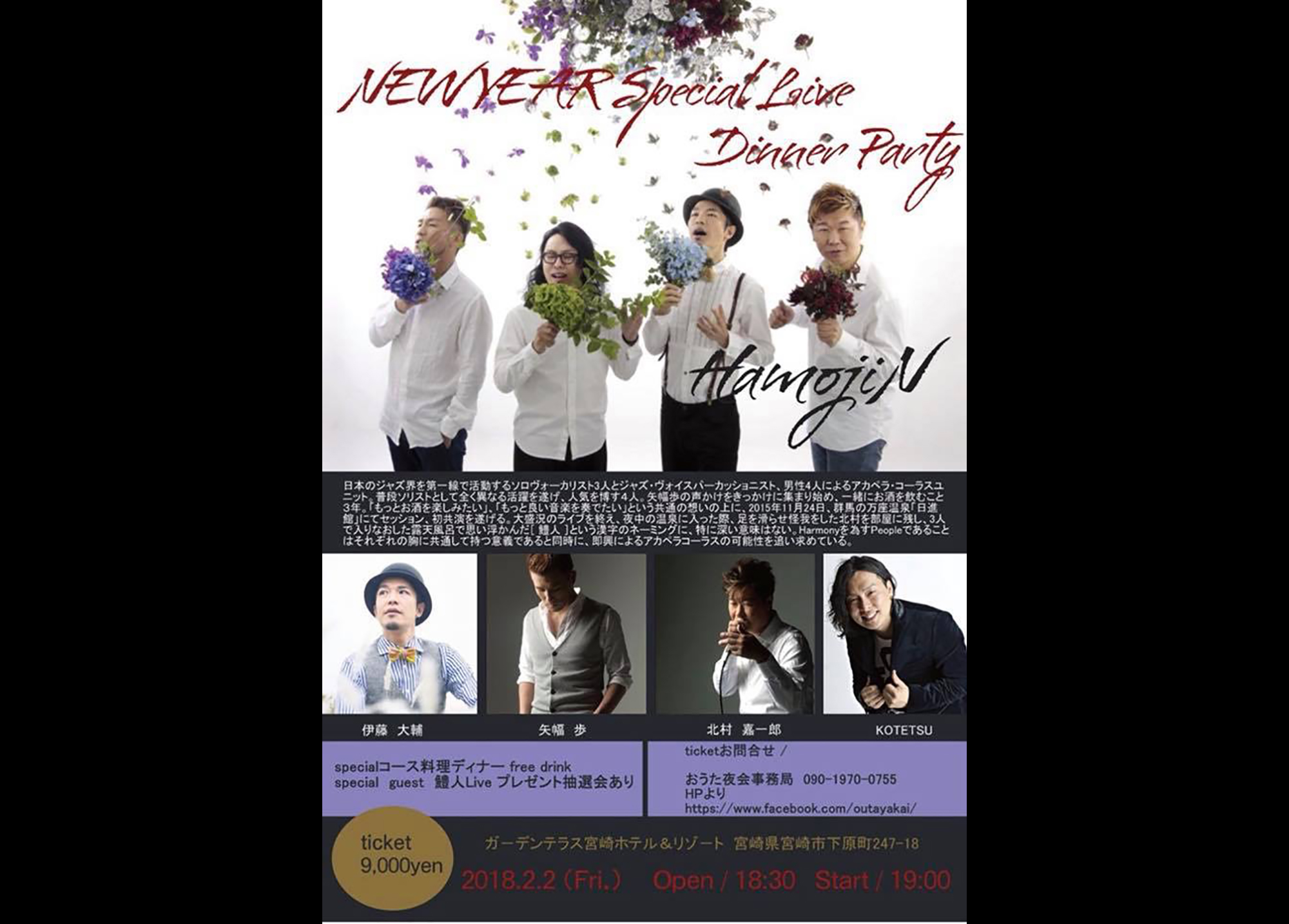 NEW YEAR Special Live Dinner Party NEW YEAR Special Live Dinner Party 日付 2018年2月2日(金) 出演 鱧人 / OA:永吉愛 会場 ガーデンテラス宮崎 ホテル&リゾート